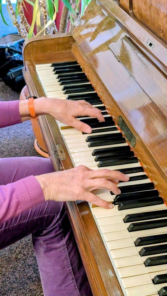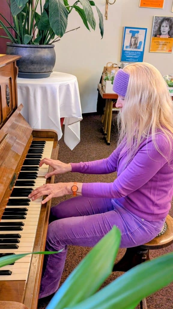 Barbara Regitz sprach in ihrem Grußwort von den persönlichen Begegnungen und betonte, wie wichtig diese sind. Bei jeder Begegnung sei es entscheidend, sich zu verstehen und dieselbe Sprache zu sprechen. „Eine Sprache, die alle Menschen auf der Welt verstehen und die die Seele mehr berührt als Hände dies je könnten, ist die Musik“, sagte sie. Deshalb stehe der IKLL-Jahresauftakt 2026 ganz im Zeichen der „Weltsprache Musik“. Sie stellte Hilde Pohl, Kulturpreisträgerin der Stadt Nürnberg 2025, vor: „Hilde ist bekannt, sie ist quasi überall zu sehen und zu hören, und sie hätte den Kulturpreis der Stadt Nürnberg schon längst verdient.“ Anschließend ging Regitz kurz ans Klavier und spielte einen Tusch. „Lassen wir uns heute von Hilde Pohl inspirieren!“, sagte sie und übergab ihr das Wort.